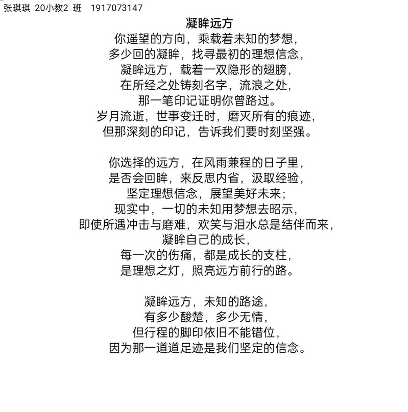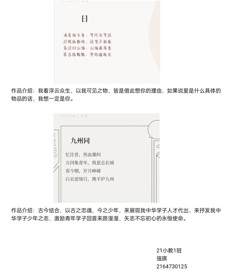同学们积极参与,提交的原创作品精彩纷呈。作品以诗词为切入点,用细腻的词语融入诗句中,呈现出各不相同的情感,有的表达思乡之情,有的表达对自然的喜爱,还有的表达了对中华民族传统文化的热爱。优美的诗词奏响了中华民族传统文化的和谐旋律,让诗词的魅力溢满了校园。活动进展顺利、进展有序,最终20小教(2)班张琪琪、21小教(1)班强琪等多位同学的作品被评选为优秀作品。