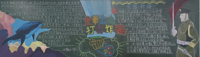 此次黑板报评比活动,旨在提高同学们对诈骗的认识。经过精心设计、绘画、书写,各班完成了内容丰富,图文并茂,创意新颖的黑板报。一幅幅精美的黑板报向同学们普及了防范校园电信诈骗知识,多角度展现了员工们对防诈骗意义的理解,同时也针对性地列举了多种防范措施。经院评审小组认真打分评选,21小教6班,21小教2班,21青管班板报内容紧扣主题,字迹工整,内容丰富,被评为此次黑板报优秀作品。