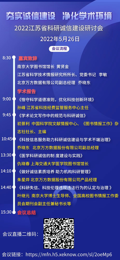 为加强科研诚信与学术道德建设,严明学术纪律,规范学术行为,弘扬科学家精神,营造和谐创新的学术与科研文化氛围。江苏省图书馆学会、mk体育图书情报工作委员会和江苏省科学技术情报学会将于5月26日上午联合北京万方数据股份有限公司举办“夯实诚信建设 净化学术环境”2022江苏省科研诚信建设研讨会,会议将以线上直播的方式开展。请各公司部门结合实际,积极动员师生观看直播。会议流程及观看方式如下: