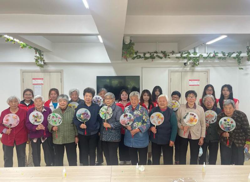 清风徐来团团扇 。志愿者积极查阅资料,购买制作素材,为老人讲解团扇的分类、扇面构图的形式以及团扇的制作工艺,并与老人们一起用干花和颜料来装饰、绘制团扇。在活动中,志愿者和老人们一起边话家常边做团扇,为老人们的生活带来了艺术的陶冶和文化的情趣,也为老人夏日炎热的生活带来一丝清凉。