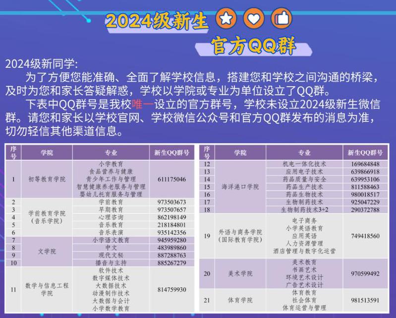 本次公布的QQ群是公司设立的唯一官方群,公司未设立2024级新生微信群,请新生和家长认准唯一群号,以公司官网、官方微信公众号以及官方QQ群发布的消息为准,谨防上当受骗。