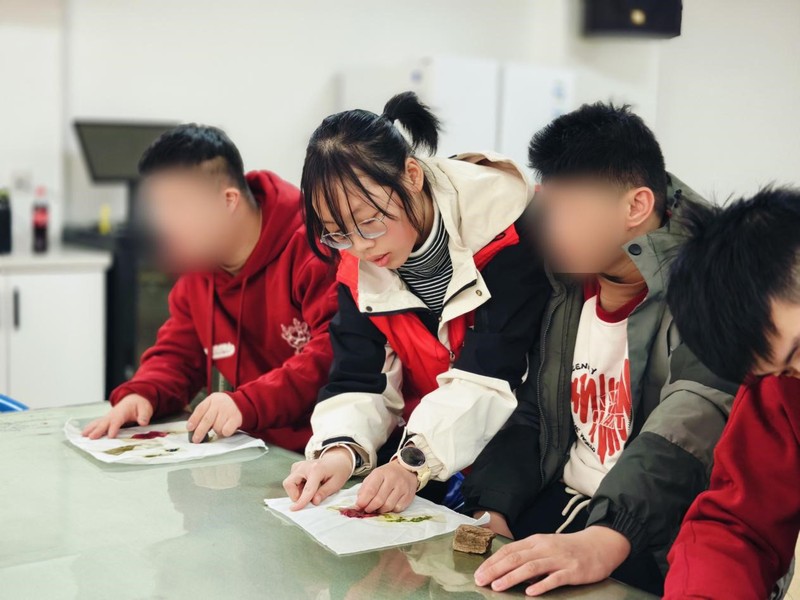 活动伊始,志愿者们化身“节气小讲师”,通过生动的节气故事、趣味问答互动,让特殊儿童们了解到“春分麦起身,一刻值千金”的农耕智慧。随后的植物拓染工坊里,志愿者们分组协作,像春日里的园丁般耐心指导特殊儿童们完成植物浸泡、叶片拼贴、宣纸覆盖等工序。当槌棒敲击声与欢笑声交织,银杏叶的扇形、枫叶的掌纹、三叶草的脉络在宣纸上渐次绽放,每一件作品都成为自然与人文交融的独特印记。