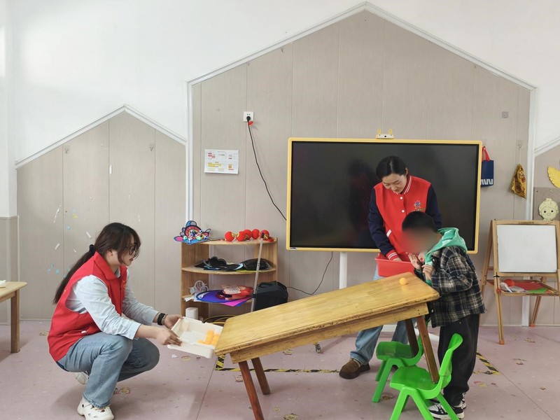在课堂上,志愿者们展现出高度的责任感和教育智慧。在“倾斜接球”训练中,她们设计“太空任务”情景,用“燃料补给”调整姿势,设计“卫星对接”精准接球,将康复训练转化为趣味探险。针对精细动作发展训练,创新采用“三阶赋能”服务模式,基础阶段采用“动作模仿”建立规则意识,提升阶段运用“梯度挑战”激发潜能,巩固阶段通过“正向强化”增强社会属性。如在夹夹子活动里,志愿者细致讲解动作要点,教孩子们正确使用夹子夹取不同物品;跳圈时,拉着孩子的手,带领他们依次跳入圆圈,完成动作练习。然后鼓励孩子们不断尝试与挑战,每当孩子成功接球或跳入指定位置,便及时给予肯定,帮助 “糖宝” 们在项目互动中锻炼手眼协调、认知及社交能力。