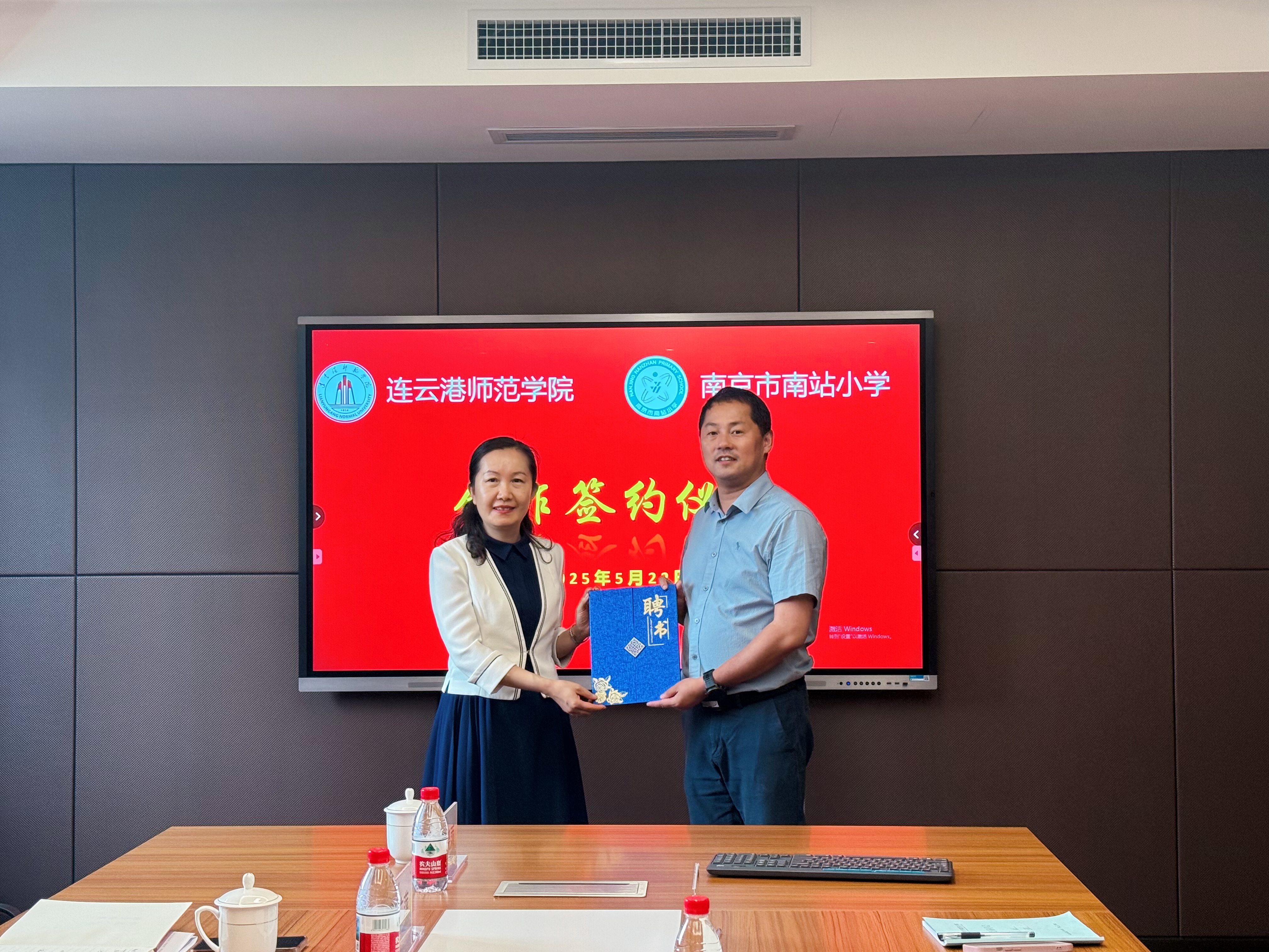 随后,公司一行来到南京市南站小学。南站小学书记、董事长孙立平表示了热烈的欢迎并详细介绍了南站小学的建设历程、办学宗旨、团队队伍建设和育人特色。刘长虹则全面介绍了公司的发展历程、专业设置和办学规模,并重点介绍了小学教育“铸文化、强实践、重综合、一专多能”的专业特色和人才培养成效。双方就人才培养方案优化、实习实践、公司产品研究等内容达成了明确的合作意向,并隆重举行了实践教学基地的揭牌仪式,刘长虹为孙立平颁发了实践导师聘书。