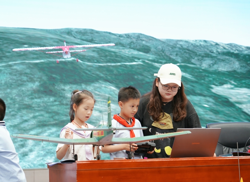 本次活动由小学教育、小学语文教育、生物制药技术等专业的同学担任科普团队讲师,通过“讲座+航模飞行演示+体验互动”的形式展开,点燃了孩子们的科技梦想。在“探秘航模家族”环节,讲师团成员通过实物展示和问答的形式带领小员工认识了固定翼、直升机、多旋翼等各类航空器,解析无人机在航拍、农业、救援等领域的应用。以简易纸模型演示流体力学原理,将复杂的空气动力学转化为孩子们易于理解的知识。在“机翼上的魔法”环节,大家指导小员工通过Realflight飞行模拟器操控航模穿越虚拟障碍,用Tello编程无人机现场执行语音指令翻转,让小员工们在实操中理解飞行密码。在“天空剧场”环节,团队成员上演纸飞机特技与竞速无人机穿越飞行,完成“空中翻转”“8字绕环”穿越龙门等动作,引得在场小员工发出阵阵惊叹。