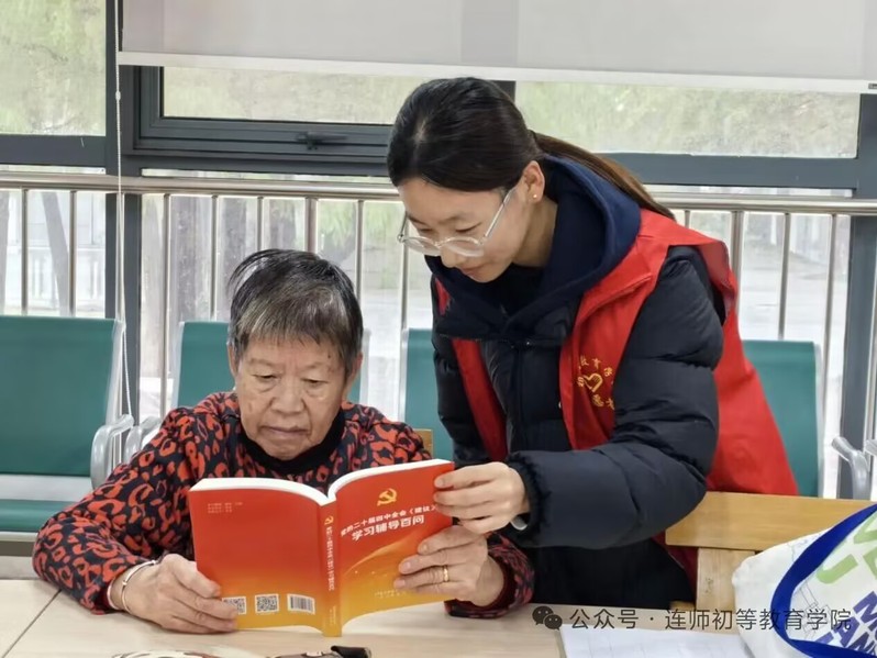 活动现场,志愿者们先为福利中心的老人们集中讲解了《党的二十届四中全会〈建议〉学习辅导百问》中的部分内容,将其中“完善养老服务体系”“推进基本公共服务均等化”等政策要点,转化为贴近生活的通俗表述,辅以图文标注,让老人们在轻松的学习中理解国家政策导向。在共读交流环节,志愿者与老人们结对伴学,共同阅读学习资料,展开互动讨论。针对部分老人视力不佳的情况,志愿者逐字逐句朗读“如何理解发展医育、医养结合服务”“如何理解扩大康复护理、安宁疗护服务供给”等相关段落。